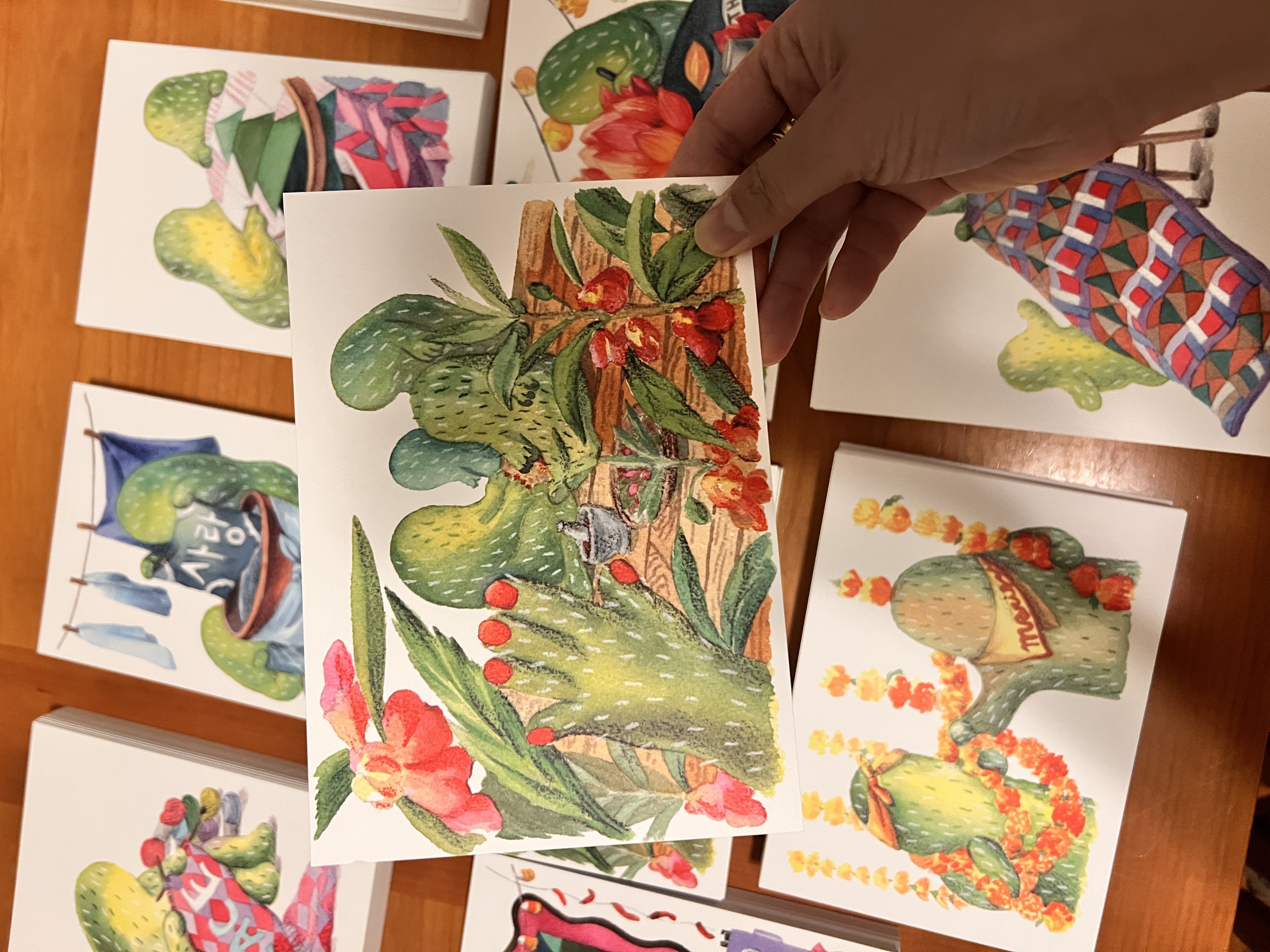 Meet the Seasonal Cactus — a year-round muse with a watercolor heart and colored-pencil charm. Originally painted on handmade paper, each cactus reflects a moment in time, blending Korean seasonal traditions with the creative hum of the art and fiber community that surrounds me.